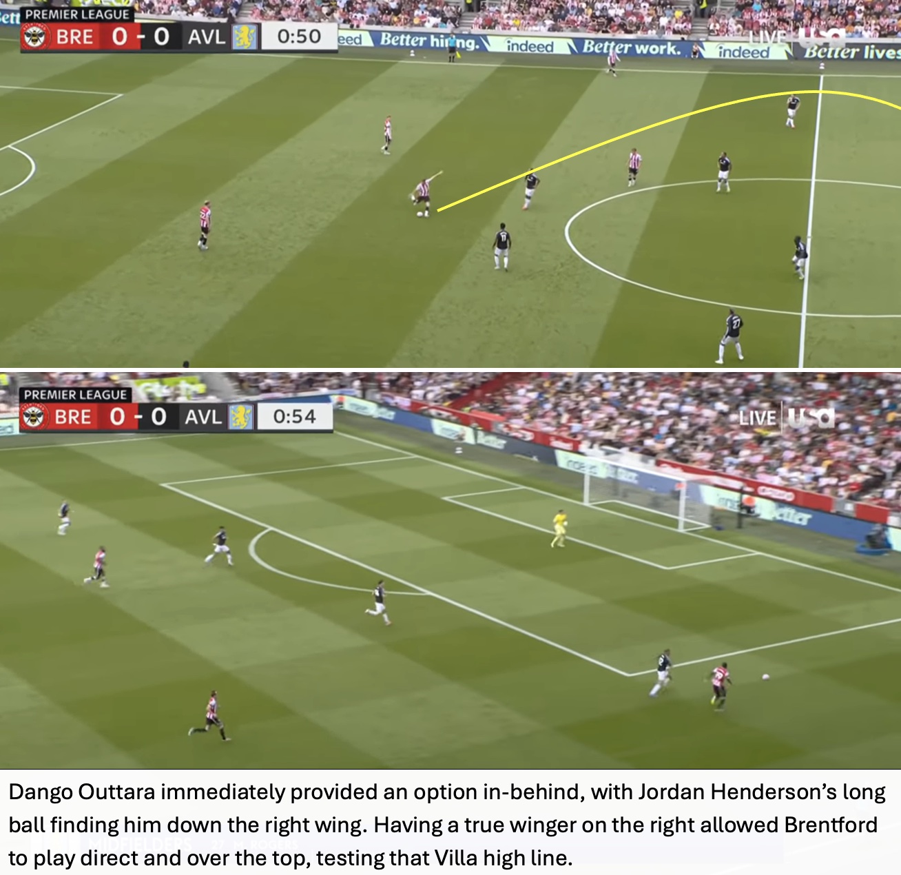 Keith Andrew’s tactics worked well for an Aston Villa side that wanted to create chances from through balls, with Brentford dropping deep and not allowing them the space to do so. Andrews also looked to attack Villa’s high line, by sending balls over the top, and Brentford scored from this exact scenario.