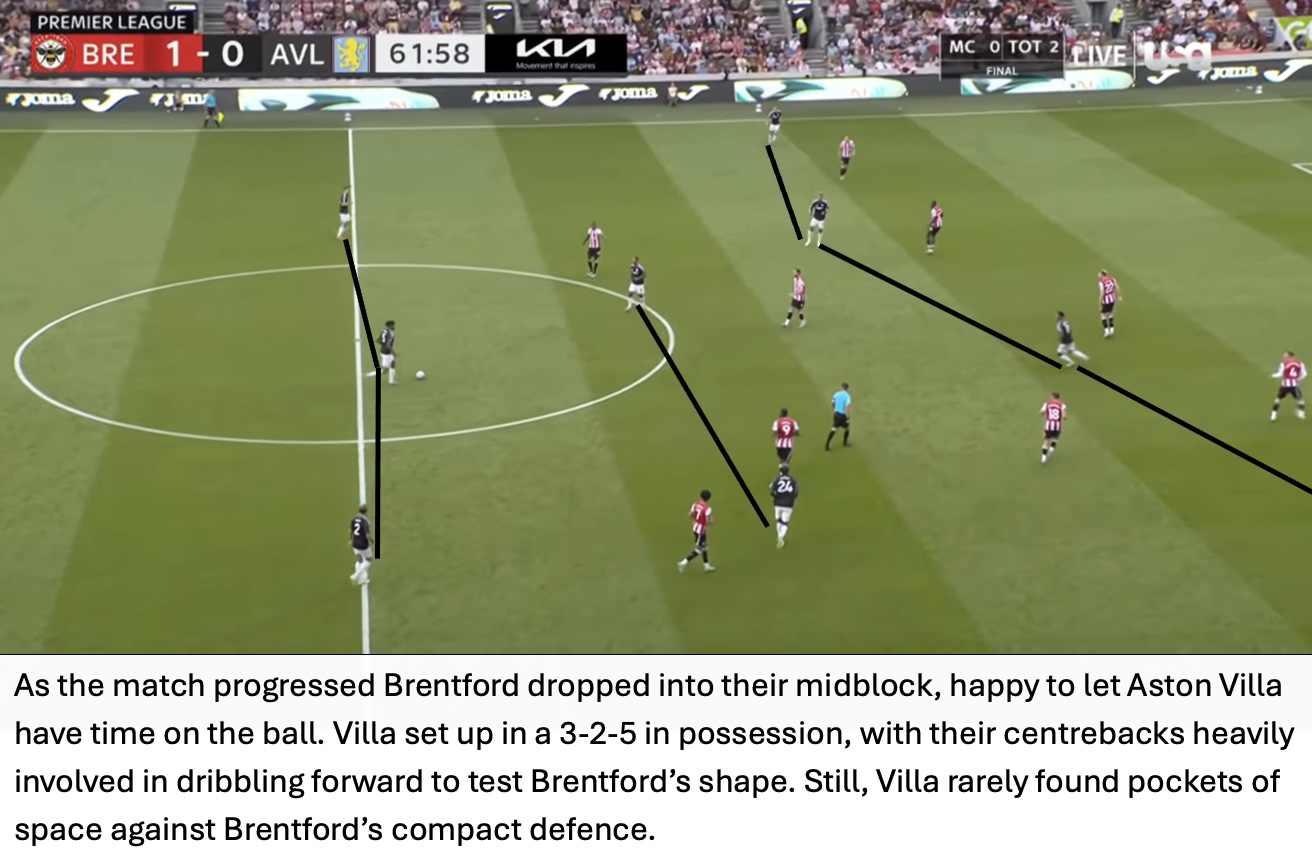 The Bees allowed Villa time on the ball and limited transitional moments. Brentford started dropping into their mid and low block after scoring and looked to hold on to the lead. Andrews trusted the structure out-of-possession and knew Villa would struggle to break it down.
