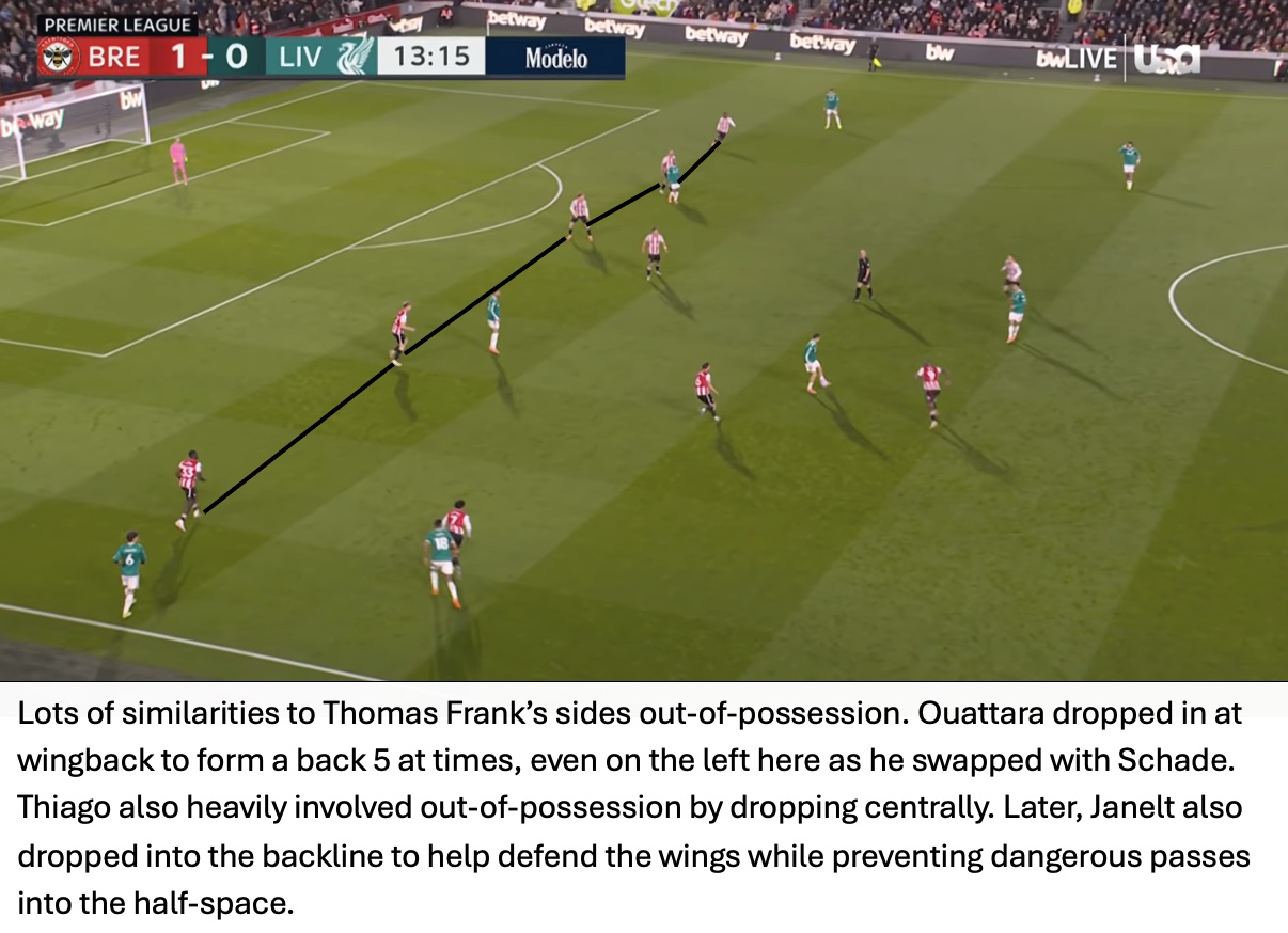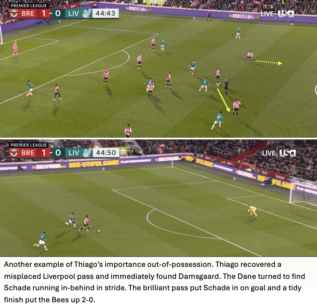 Kevin Schade not only grabbed a goal but had 5 key passes and somehow ended with 6 of 7 aerial duels won, a difficult feat for a winger against Liverpool (1st in aerial duel win percentage).