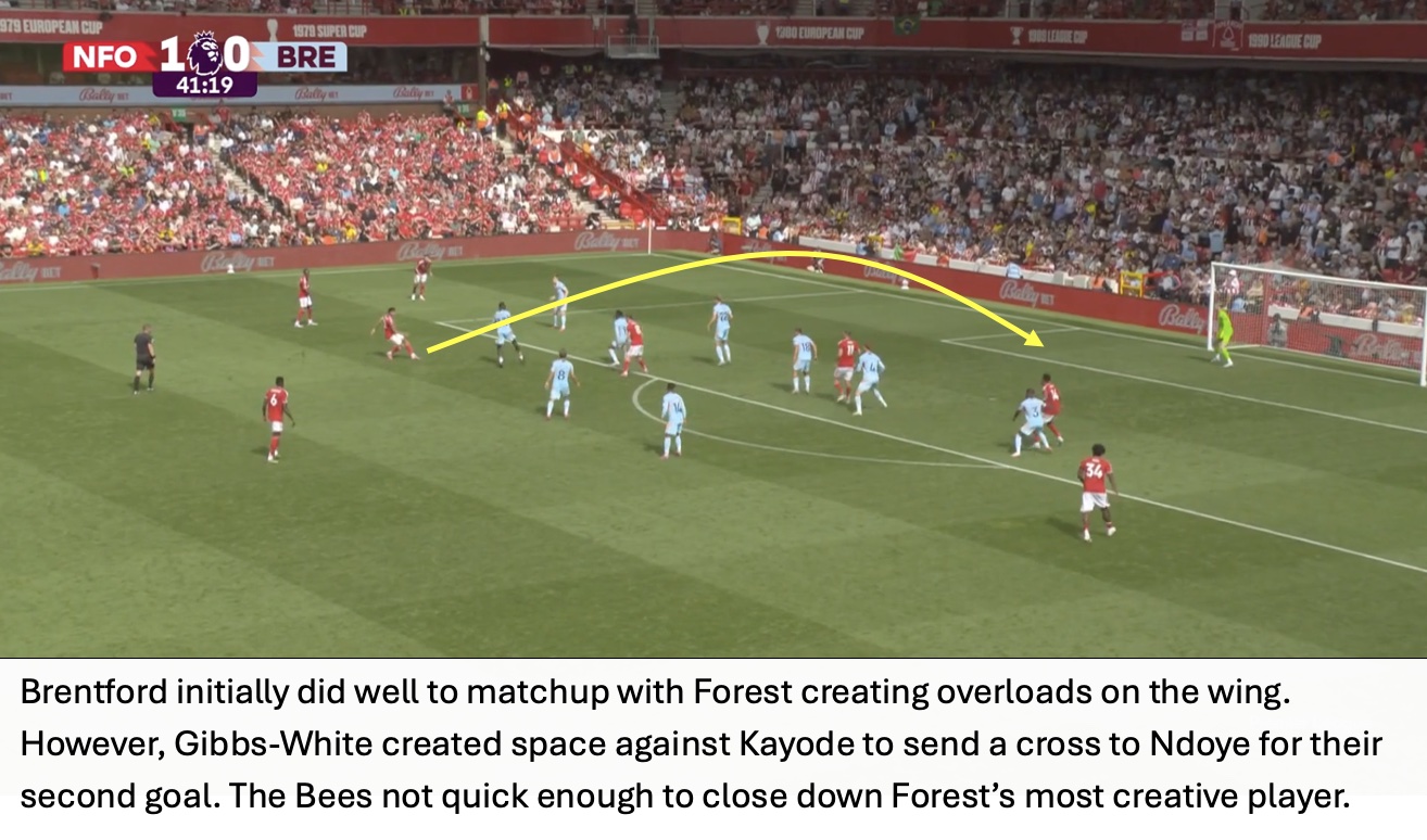 Keith Andrews’ setup did provide more balance to Brentford’s squad than in the preseason match versus M’Gladbach but generally played to Nottingham Forest’s strengths. Relying on wing play put Rico Henry and Lewis-Potter in difficult positions to defend counters.