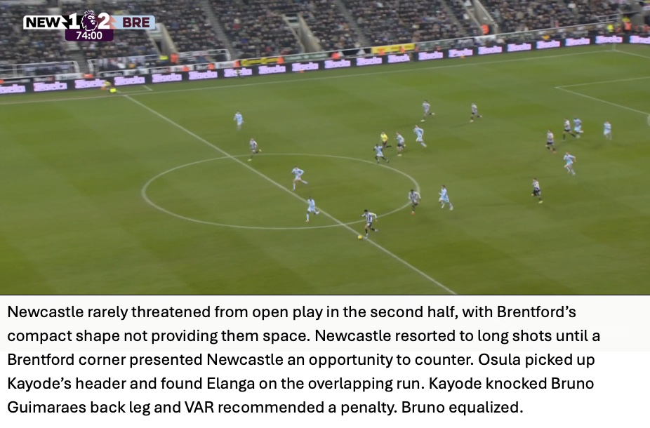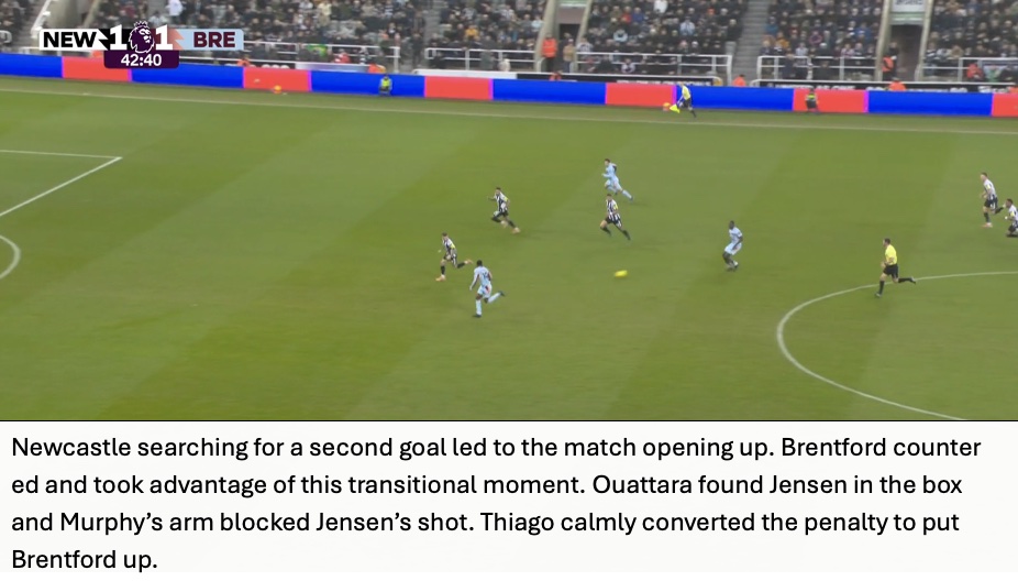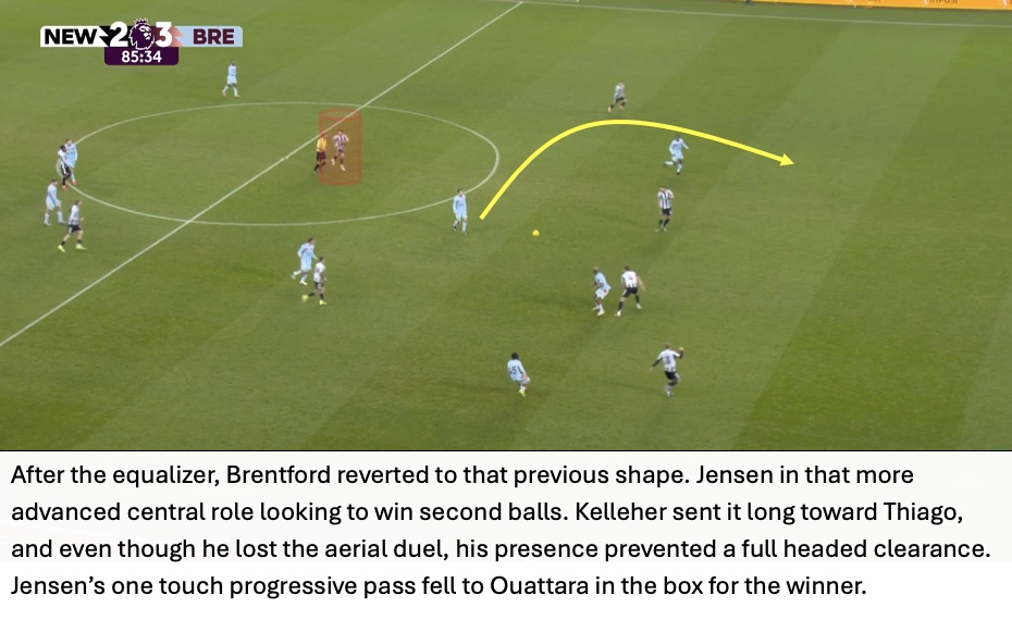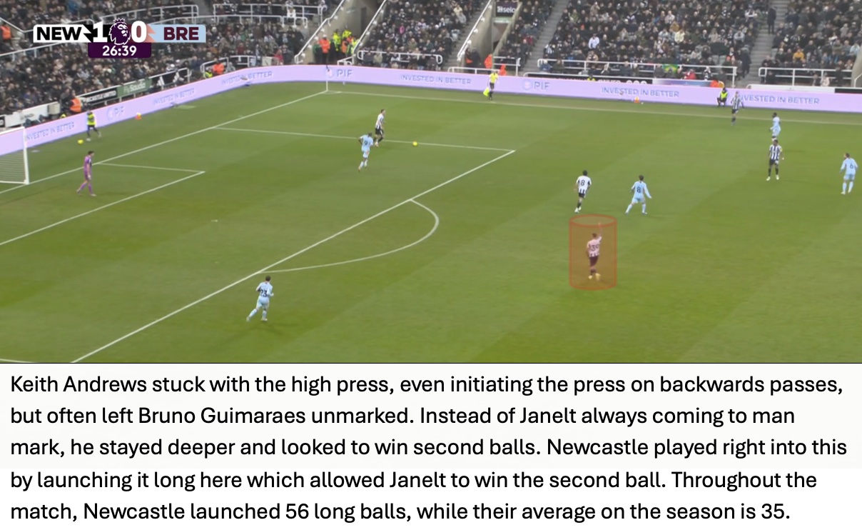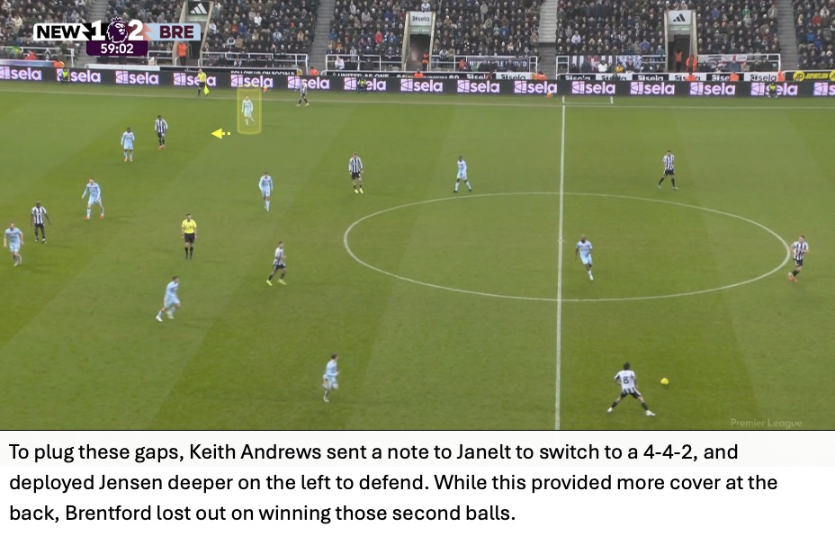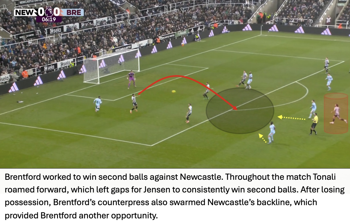 Even though Newcastle won 59% of aerial duels, Brentford cleaned up the second balls and immediately attacked from these situations. The importance of this seen in Brentford’s third goal with Jensen waiting for the second ball with Tonali nowhere close.