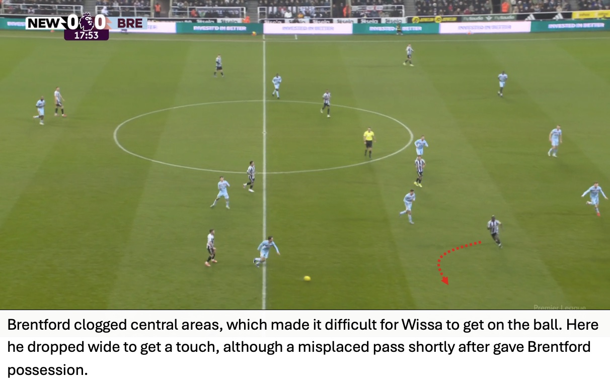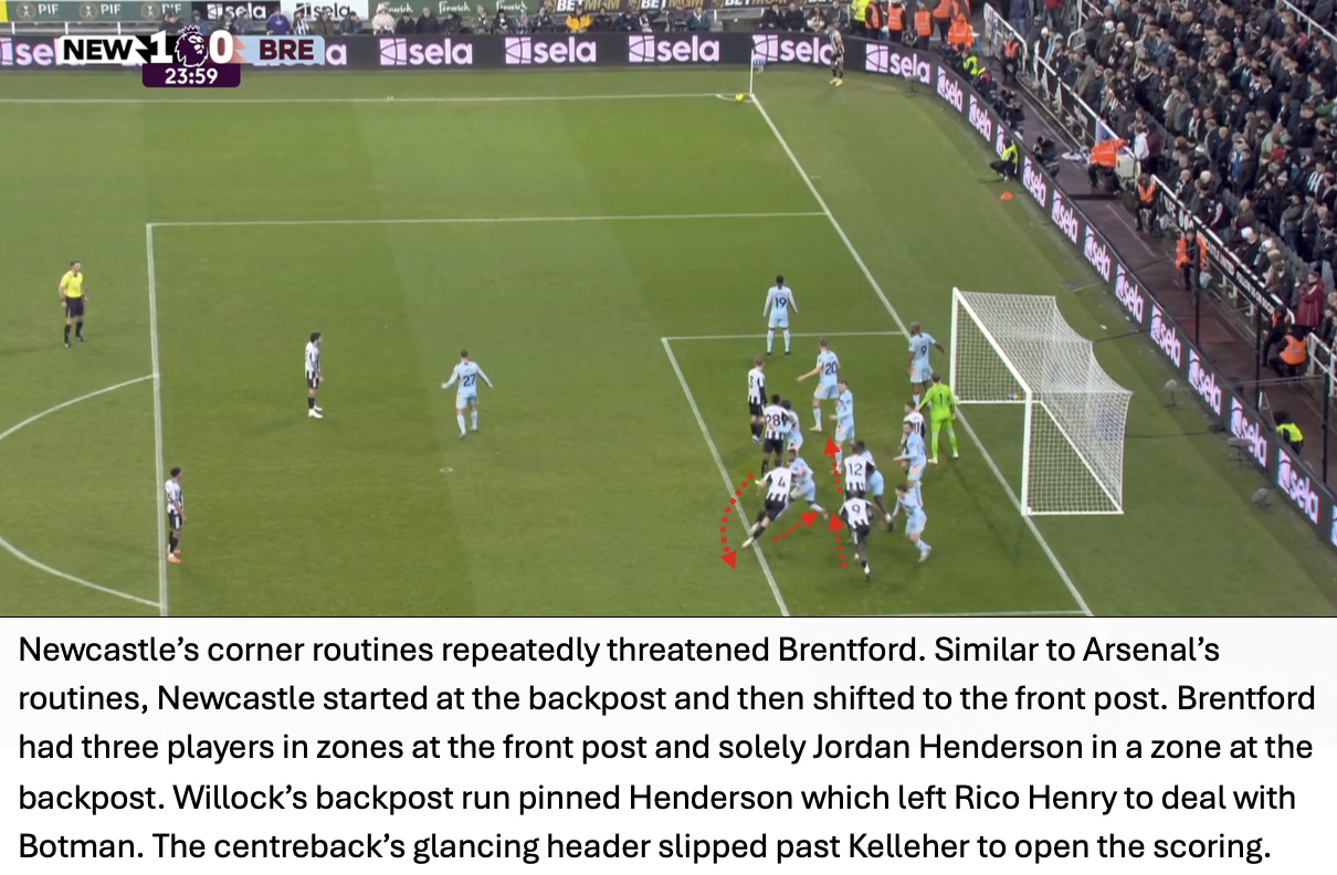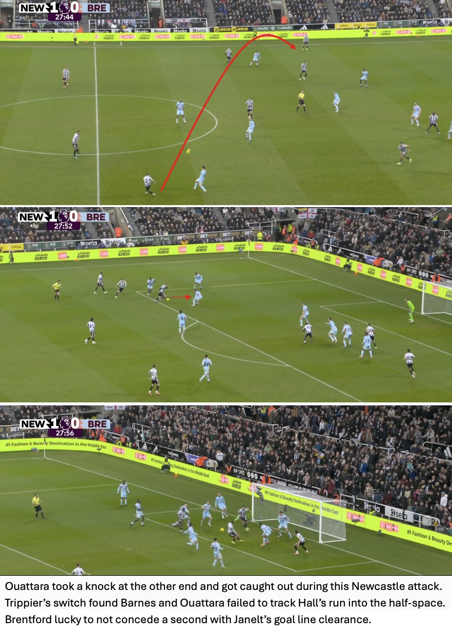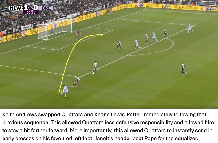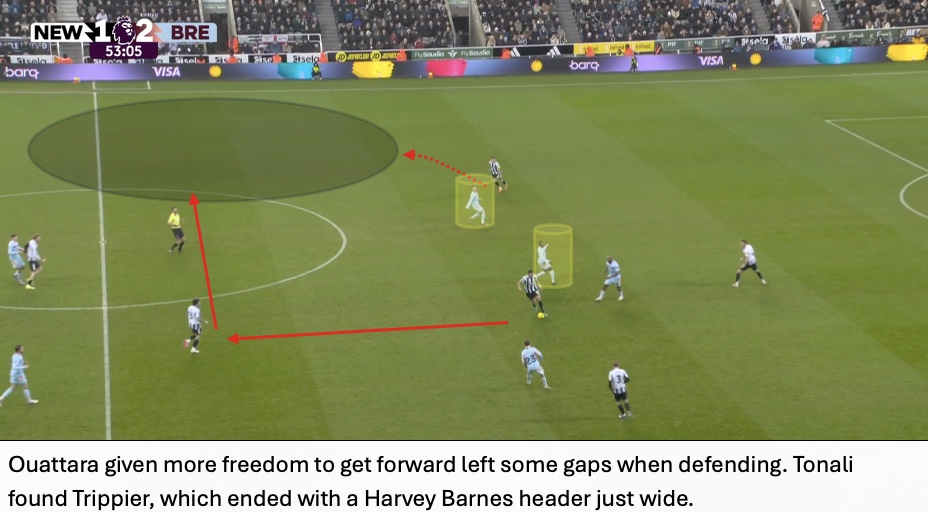 Even though Newcastle won 59% of aerial duels, Brentford cleaned up the second balls and immediately attacked from these situations. The importance of this seen in Brentford’s third goal with Jensen waiting for the second ball with Tonali nowhere close.