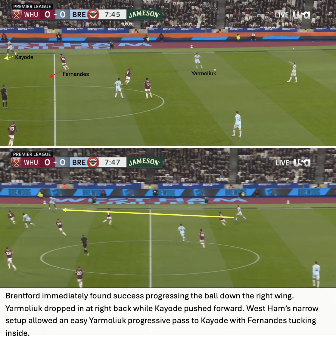 Especially in the first half before Nuno switched to 5 at the back, Kayode routinely found success getting forward. West Ham’s very narrow set up allowed Kayode and Ouattara to easily progress the ball and then Kayode completed 4 crosses in the box.