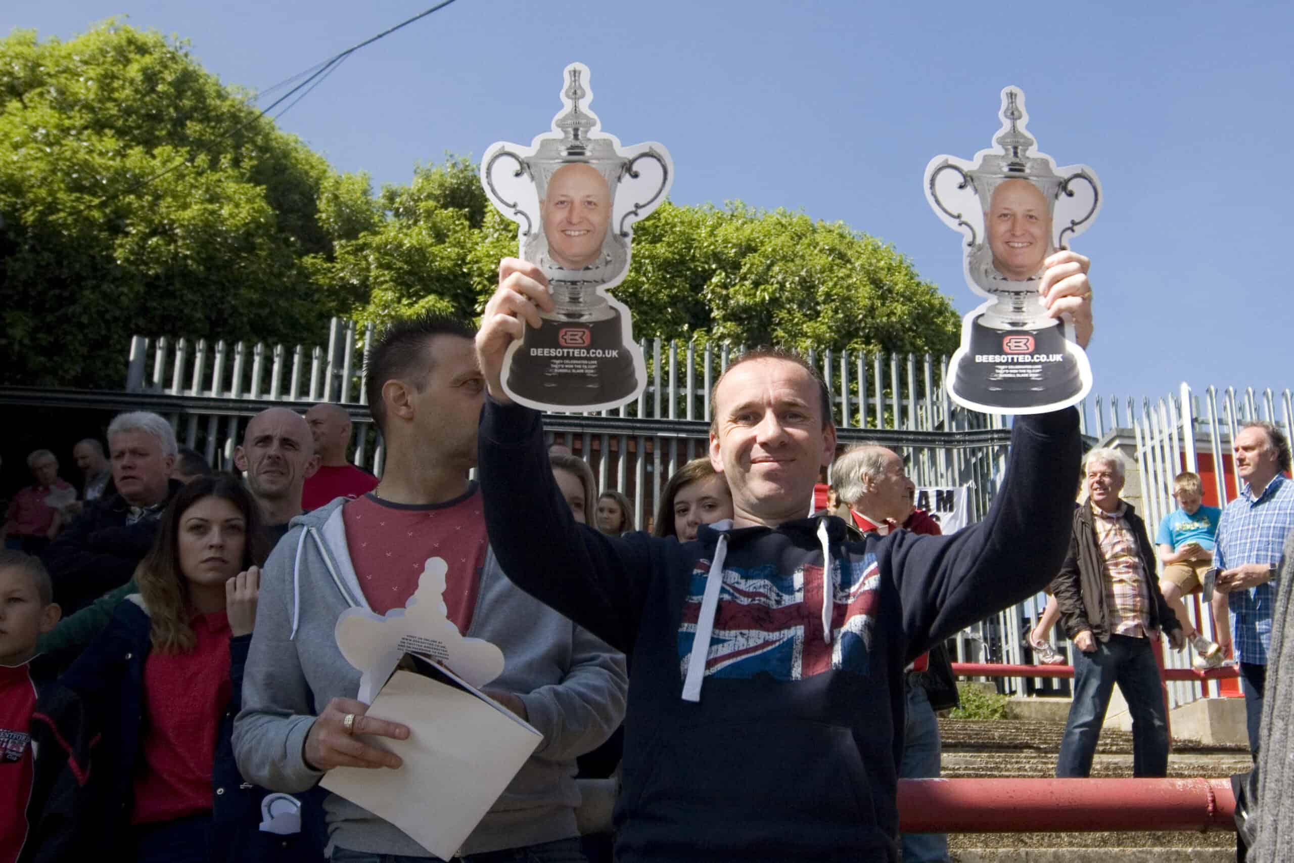 That line came back to haunt him. As you can see on the video, Bees fans sang the cup celebration songs every game until the end of the season, waving trophies and FA Cups with Slade’s face on them.