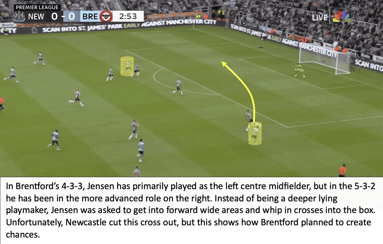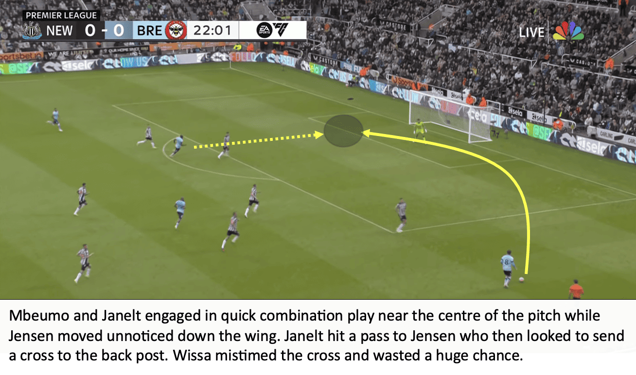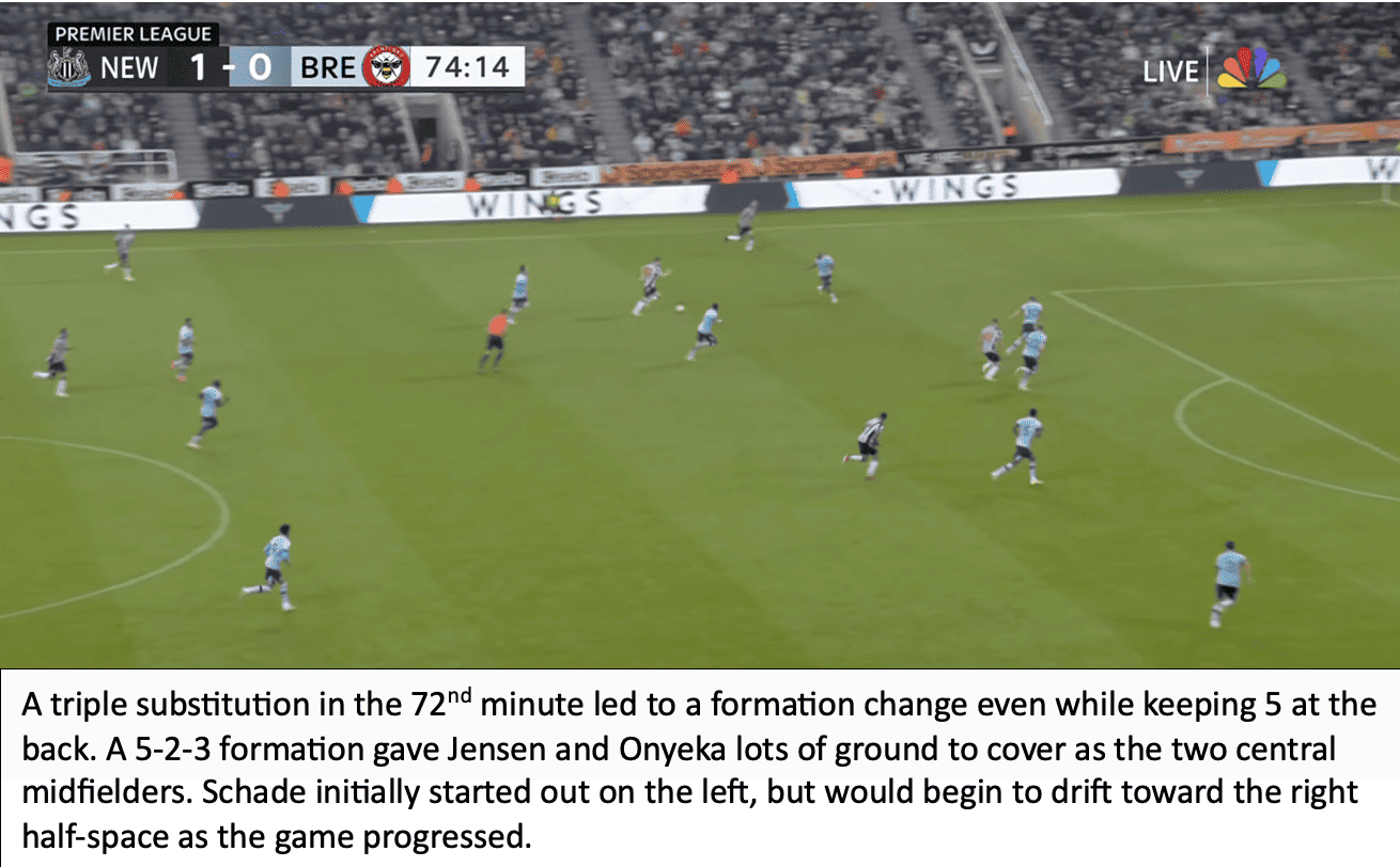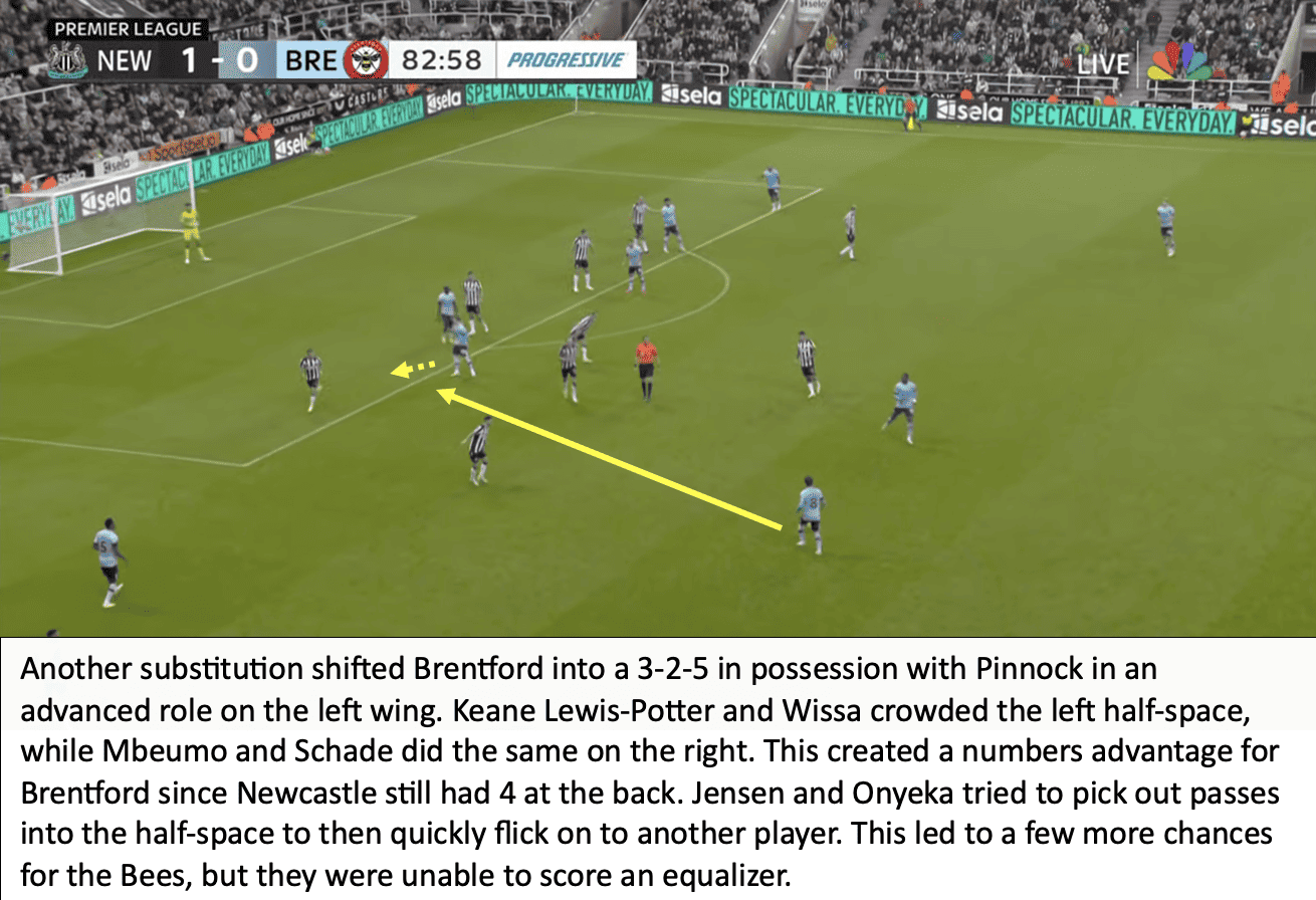 The late tactical adjustments provided Brentford’s best opportunities of the match, but the Bees still couldn’t find the end product. Shifting to 5 at the front, Brentford forced Newcastle into a low block and found ways to get players on the ball in the box. Unfortunately, Brentford were unable to take advantage of these situations.