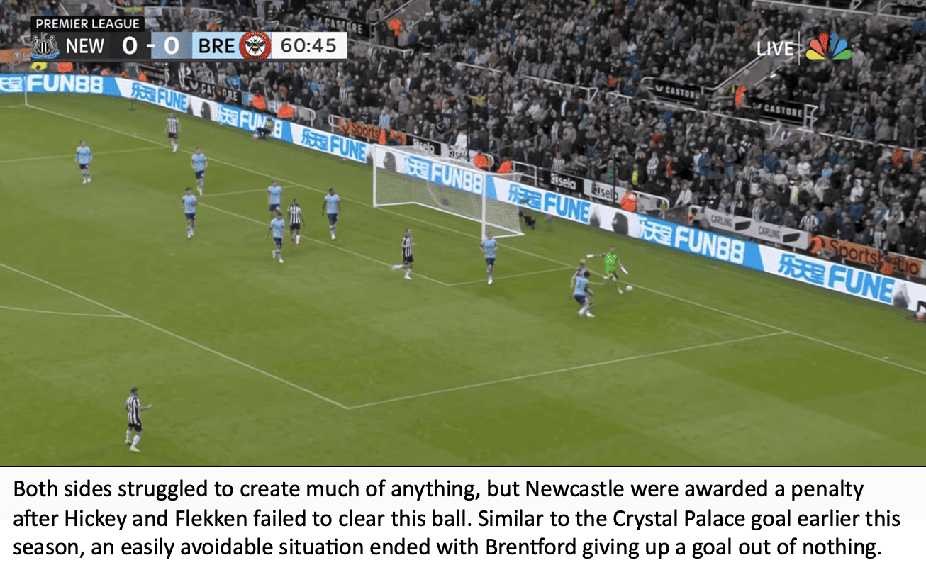 At first glance, the xG makes it look like Newcastle dominated Brentford, but when looking at non-penalty xG it was much closer with Newcastle only having 0.6 npxG. Overall, Brentford did a good job shutting Newcastle down without dropping into their low-block as much as some would think.