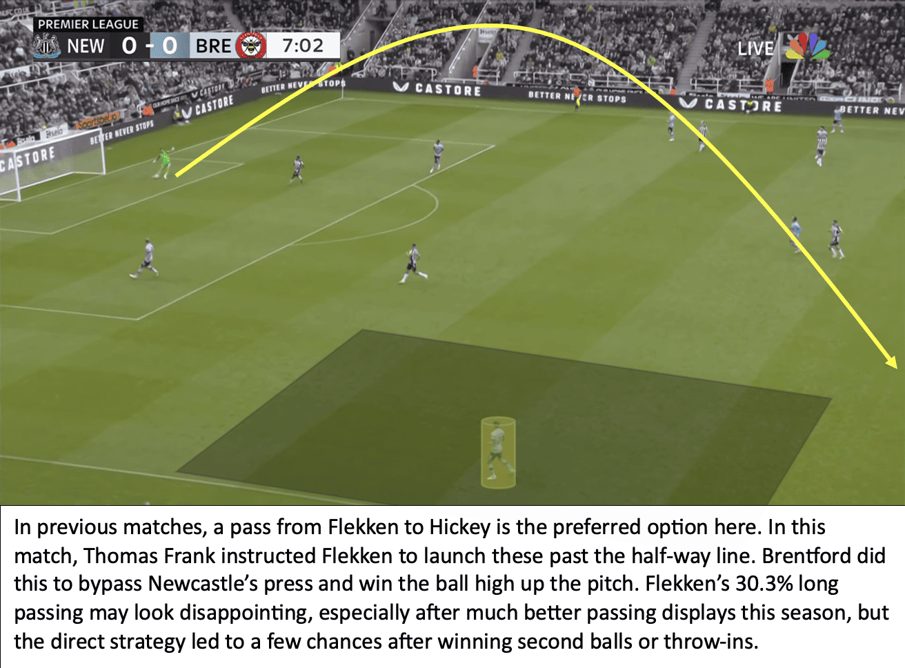 Much was discussed about Flekken’s distribution, with a poor passing percentage, but most of this boils down to tactics. Flekken’s long passes were aimed toward the intersection of the half-way line and touchline, trying to bypass Newcastle’s press. This occasionally worked, resulting in throw-ins, but was far too inconsistent to create enough chances going forward.