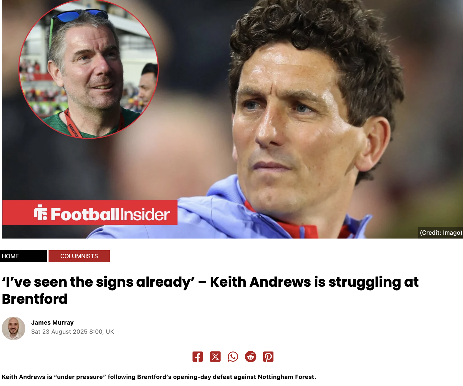 However, in the build-up to the game, some parts of the media leaned heavily on doom and gloom. James Murray’s sensationalist piece “I’ve seen the signs already—Keith Andrews is struggling at Brentford” didn’t exactly pull its punches. Framed as a critique of Andrews, like so many of these so-called analyses it was, in truth, a veiled swipe at Brentford itself.